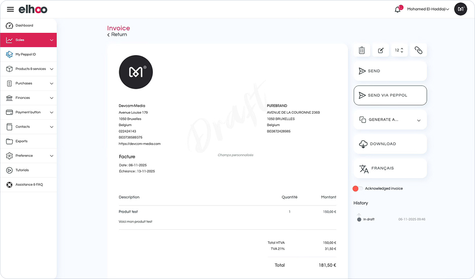 With Elhoo, you can send and receive your invoices on the Peppol network in just a few clicks. No more complex formats or legal constraints: everything is already ready for you.