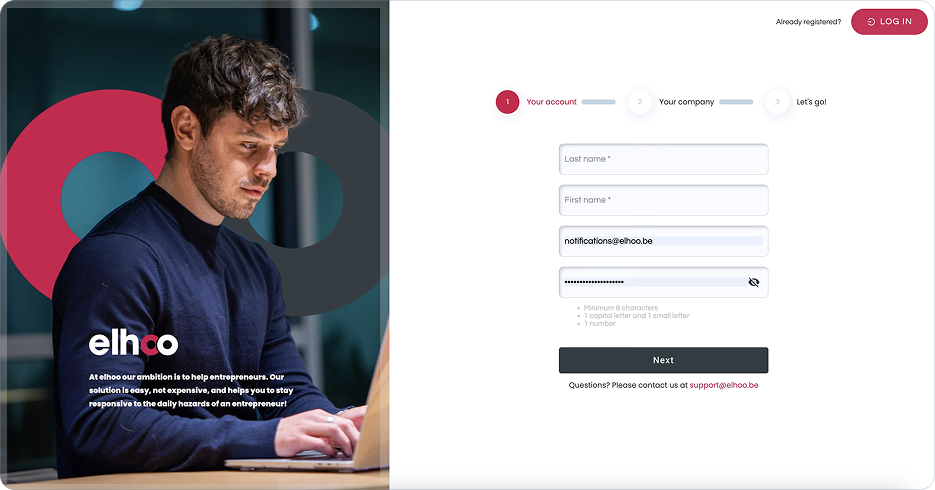 2. Enter your company’s basic details (name, country, VAT/company number, IBAN, email, phone).