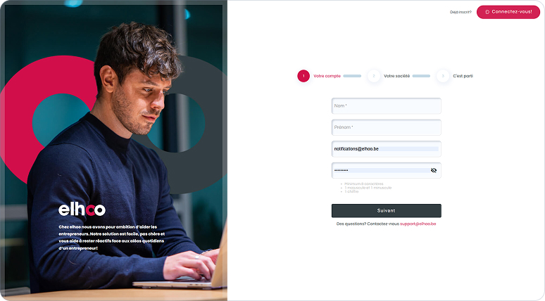 Inscrivez-vous avec le nom de votre entreprise et votre e-mail professionnel. Vous testez toutes les fonctionnalités pendant 14 jours, sans engagement.